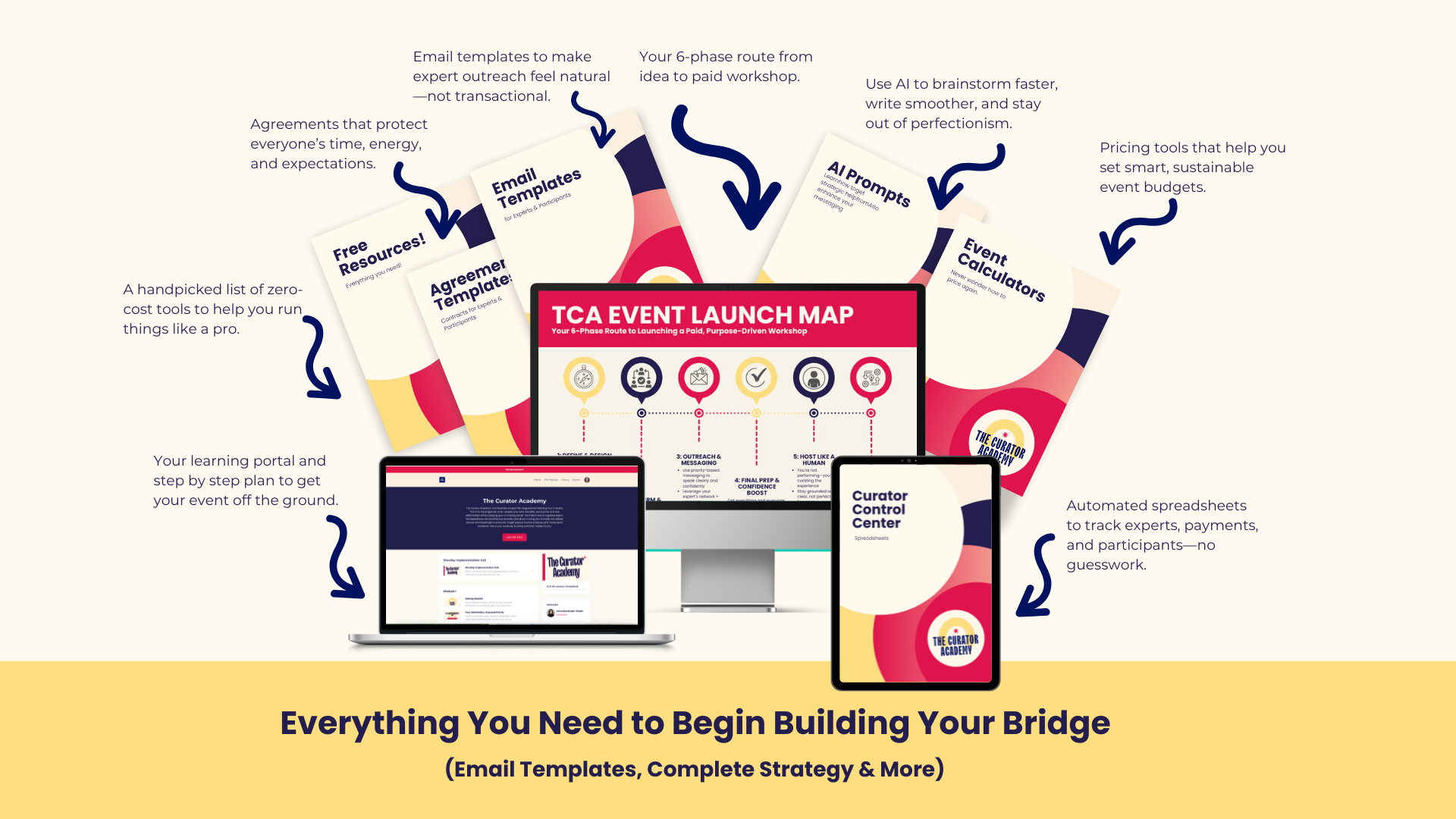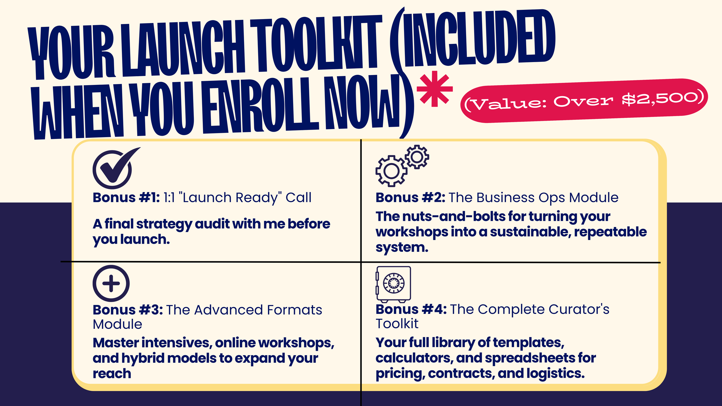 This isn't passive learning. You'll be taking action from day one—using our proven Curator Method to design, promote, and run a paid workshop that supports your growth, builds your network, and earns while you learn.